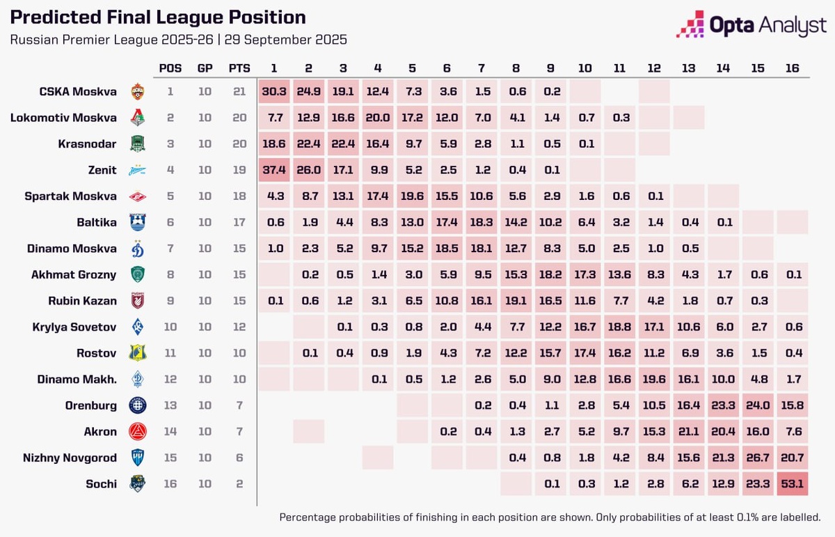 После 10-го тура суперкомпьютер Opta посчитал все вероятные позиции российских клубов на финише чемпионата. По его прогнозам, чемпионом станет «Зенит», на его победу компьютер дает вероятность 37,4%, главным конкурентом сине-бело-голубых он посчитал ЦСКА, на его чемпионство он дает 30,3%, в действующего чемпиона он верит гораздо меньше, «Краснодару» досталось всего 18,6%. Интересно, что в «Локомотив», у которого столько же очков, как и у «Краснодара», и на одно больше, чем у «Зенита», компьютер совсем не верит, на его чемпионство он дает всего 7,7%, прогнозируя ему лишь 4 место. «Спартак», по его прогнозам, и вовсе так и останется лишь пятым. Как по мне, прогноз довольно сомнительный. Компьютер явно не берет в расчет длительный зимний перерыв, который погубил ни одного иностранного тренера, он считает вероятные исходы матчей из того, в какой форме в данный момент находятся клубы, так что 30,3% на чемпионство ЦСКА — это явная переоценка, то, как будут выглядеть армейцы во второй полови