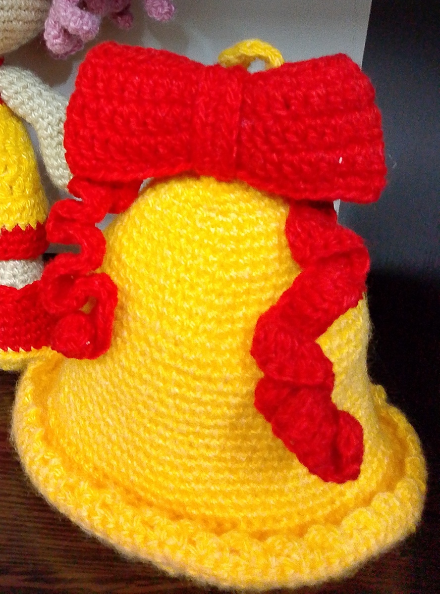 Бант. (Колокольчик 4 часть.) - 40 в п в кольцо. - 9 рядов по 40 ст. Обвязываем край аналогично как в шапочке по 3 в п. Перемычка на бант. - 15 в п со 2 ой петли 13 ст, в последнюю петлю прибавка из 2 х ст. По второй стороне 13 ст. Сшить перемычку посередине банта. Ленточка для банта. - 35 в п со 2 ой петли в каждую петлю по 2 ст с Н. До конца ряда. Далее набираем ещё 35 в п - со 2 петли в каждую петлю по 2 ст с Н. Закрепить ленточки под бантом. Пришить бант на шапочку- колокольчик. Шнур для шапочки. ( Подвеска) - 2 в п, первую петлю не затягиваем. Вводим крючок в 1 петлю, подхватить нить и провяжите петлю- на крючке 2 петлю. Так привязывать пока из этого шнура не получится петля, если сложить в двое. Примерно 8 см в длину. Сложить в двое, пришить к шапочке.