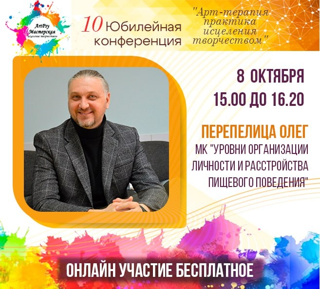 🎨 МК "Уровни организации личности и расстройства пищевого поведения" Время: 8 октября 15.00-16.20 ⭐️Спикер: Олег Перепелица Магистр практической психологии, психотерапевт, опыт работы более, 12 лет. Сертифицированный арт-терапевт, эксперт в области системного моделирования и телесной терапии. Соавтор проекта «Психологи онлайн», организатор фестивалей, научно-практических конференций и марафонов. ✨ Участие бесплатное!!! Ссылка на регистрацию https://forms.yandex.ru/u/68adf277493639046ec1bc1b 🌸Также вы можете приобрести записи по ссылке https://artpsy.top/kh-yubilyeynuyu-konferentsiyu-art-terapiya-praktika-istseleniya-tvorchestvom Будем рады вас видеть⭐️