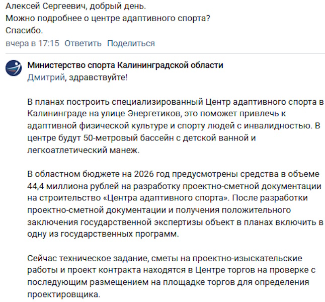 В «Центре адаптивного спорта», который собираются построить в Калининграде, планируют разместить 50-метровый бассейн с детской ванной и легкоатлетический манеж. Об этом сообщили представители регионального министерства спорта в комментариях на странице губернатора Алексея Беспрозванных в соцсети «ВКонтакте». Рассказать подробнее о будущем центре попросил один из посетителей страницы. «В планах построить специализированный „Центр адаптивного спорта“ в Калининграде на улице Энергетиков, это поможет привлечь к адаптивной физической культуре и спорту людей с инвалидностью. В центре будут 50-метровый бассейн с детской ванной и легкоатлетический манеж», — говорится в ответе минспорта. В министерстве также напомнили о том, что на разработку проектной и рабочей документации для строительства учреждения выделяют более 44 млн рублей. «После разработки проектно-сметной документации и получения положительного заключения государственной экспертизы объект в планах включить в одну из государственных