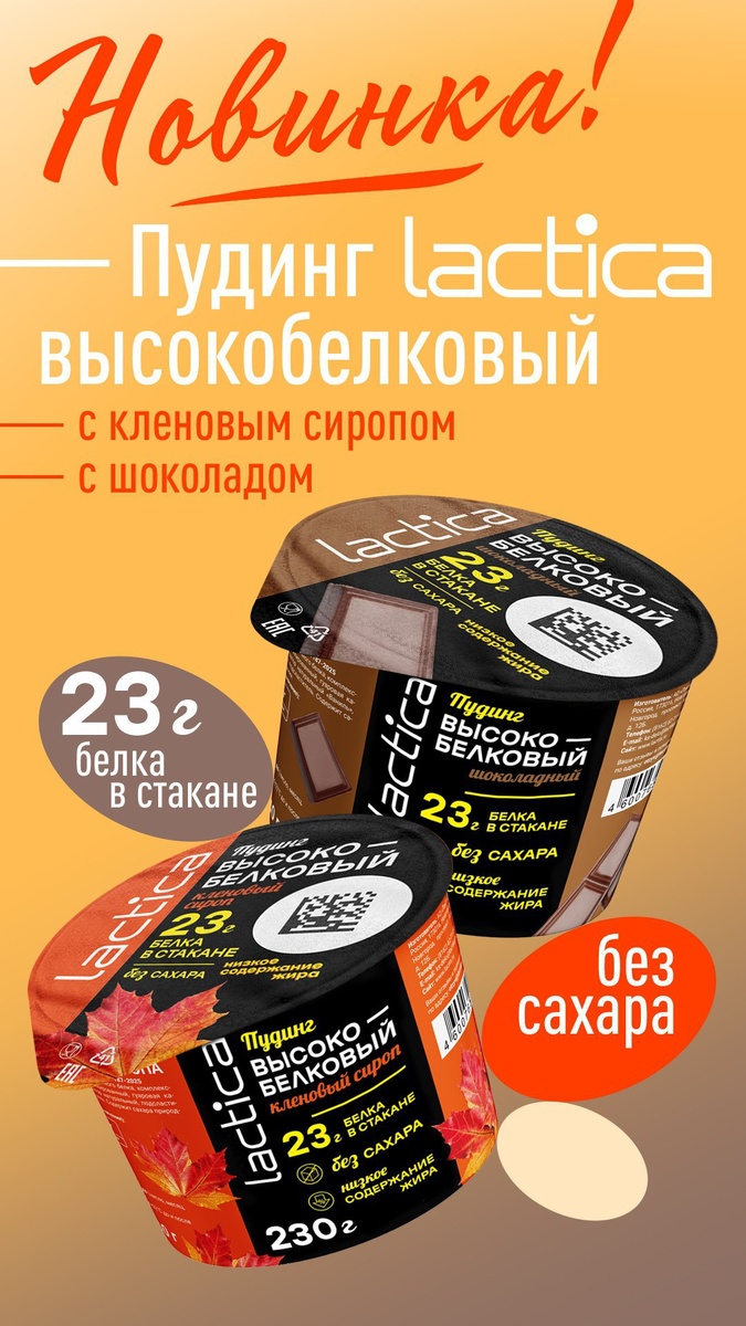 Новинка от Lactica! 🌟 Высокобелковые пудинги со вкусом кленового сиропа 🍁 и шоколада 🍫! Каждый пудинг содержит 23 г белка 💪, не содержит сахар ❌ и заменителей молочного жира. Это легкий и низкокалорийный фитнес-десерт, который подарит энергию ⚡ на весь день, до или после тренировок.
