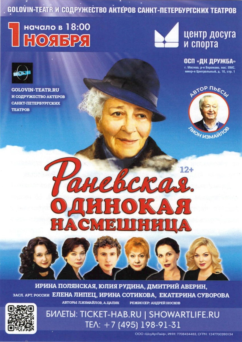 Спектакль «Раневская. Одинокая насмешница» 01.11.2025 18:0 0Драматическая комедия в 2-х действиях .Гастроли из г. Санкт-Петербурга ! Легендарный спектакль, спектакль-посвящение, восхищение и дар Великой актрисе Фаине Раневской, десятки тысяч восторженных зрителей в разных уголках России, Зарубежья. Спектакль, который с аншлагами в течение нескольких лет проходит на сцене Санкт-Петербургского Академического театра комедии имени Н.П.Акимов а. Продолжительность спектакля: 2 часа 40 минут с одним антрак том. Категория 12+ Билеты онлайн: https://iframeab-pre9474.intickets.ru/seance/67292888/ #анонсывороново #анонсытинао #новоститинао