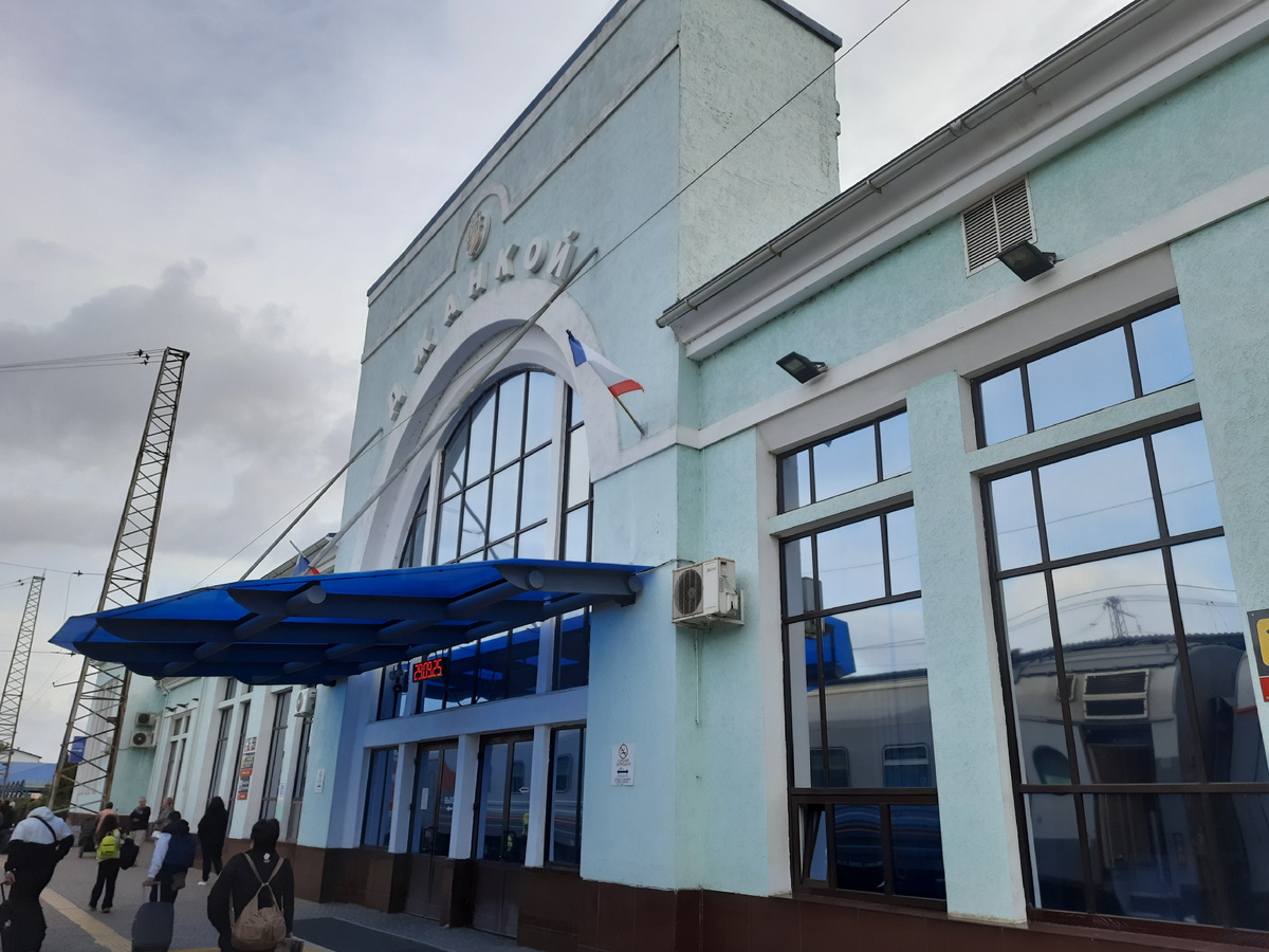 Ну вот мы уже и в Евпатории. Доехали хорошо, правда, ночью спали мало, в 4 утра проснулись, когда стояли в Тамани, да так я больше и не заснула. Лежала и слушала аудиокнигу. В 8 утра в Джанкое вышли погулять. Табличка на здании вокзала. Сфотографировались у красивого, но неработающего фонтана). Наш поезд. Потом я все-таки немного ещё подремала и чуть не проспала Евпаторию)). Муж разбудил меня за 15 минут до прибытия. Вышли с вокзала, на провокации таксистов поддаваться не стали, а пошли на автобус. Правда, автобус не стали дожидаться, решили ехать на трамвае с пересадкой. Интернета в телефоне у нас, конечно, не было. Мы заранее все маршруты общественного транспорта посмотрели и записали на бумажку). Трамваи в Евпатории узколейные, такие же как и в Пятигорске. Только в этих двух городах в России такие трамваи. Стоимость проезда всего 35 руб. А трамваи внутри современные, есть валидаторы для оплаты, российские карты проходят. Также есть информационное табло с остановками и ещё