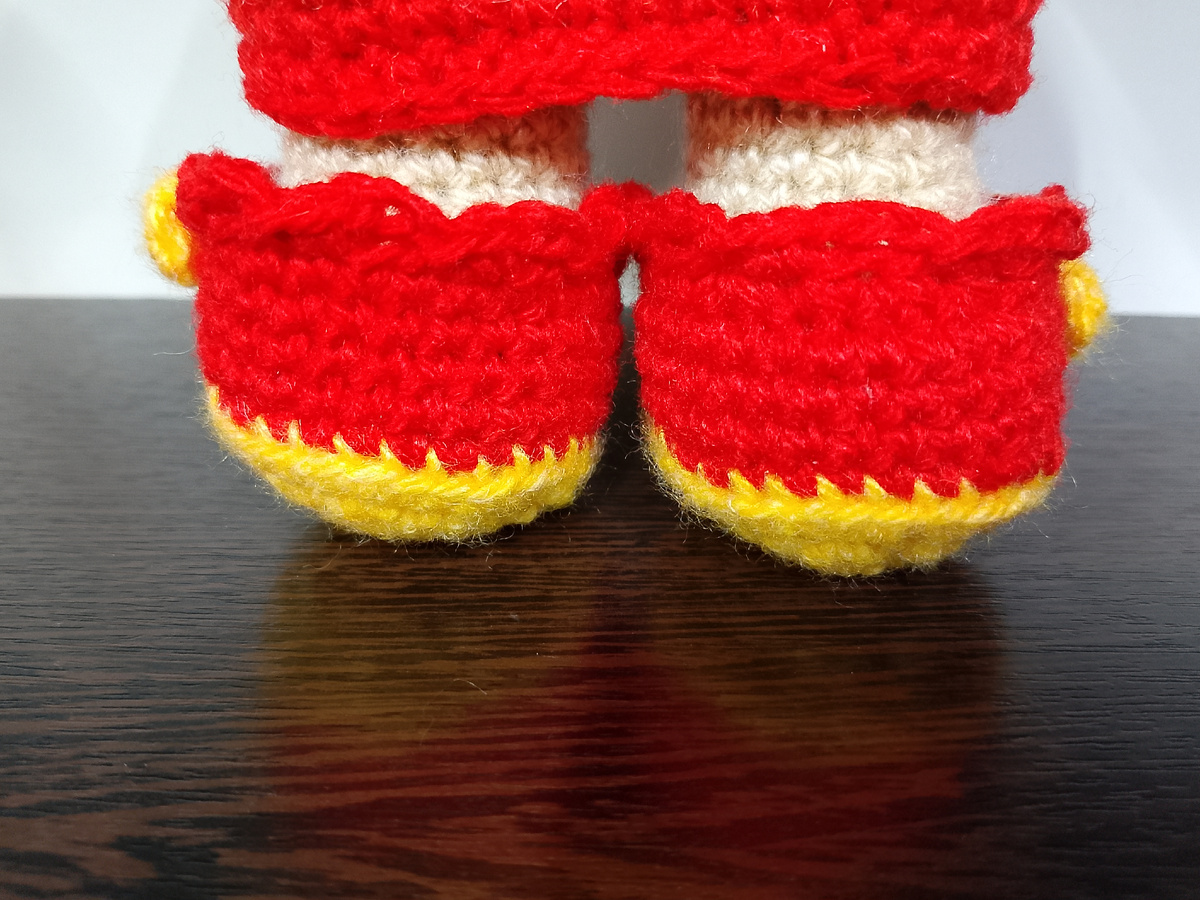 (Колокольчик 5 часть) - КА 6 ст. - 6 пр. (12) - 1 ст, 1 пр. (18) - 2 ст, 1 пр. (24) - 3 ст, 1 пр. (30) - Меняем пряжу за задние ПП 30 ст. - 3 ряда по 30 ст. - 10 ст, 4 уб, 10 ст, 1 уб. (25) Обвязываем верх по 3 вп, через одну петлю. Нить обрезать, закрепить. Бант на туфельку. - 3 в п, 2 ст с Н, 3 в п, 2 ст с Н, СС. Кольцо стянуть, сформировать бант. Прикрепить к туфельке.