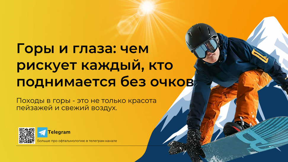 Походы в горы - это не только красота пейзажей и свежий воздух, но и серьёзная нагрузка на организм. Одним из самых уязвимых органов в высокогорье остаются глаза. Многие туристы и альпинисты недооценивают этот факт, а зря: ученые давно доказали, что глаза в горах подвергаются особым рискам. С каждым километром подъёма уровень ультрафиолетового излучения увеличивается примерно на 10–12% (по данным Всемирной организации здравоохранения). На высоте 3–4 тысяч метров доза УФ-лучей значительно выше, чем у моря. Это прямой риск для развития «снежной слепоты» - острого фотокератита, при котором роговица получает ожог от избыточного ультрафиолета. Симптомы: сильная боль в глазах, слезотечение, светобоязнь и временная потеря зрения. Снег отражает до 80–90% ультрафиолетового излучения (для сравнения: песок отражает около 20%, а вода - 10%). Поэтому даже в пасмурную погоду глаза получают двойную дозу света - прямую и отражённую. Отсюда - быстрый риск ожога роговицы. При длительном пребывании без