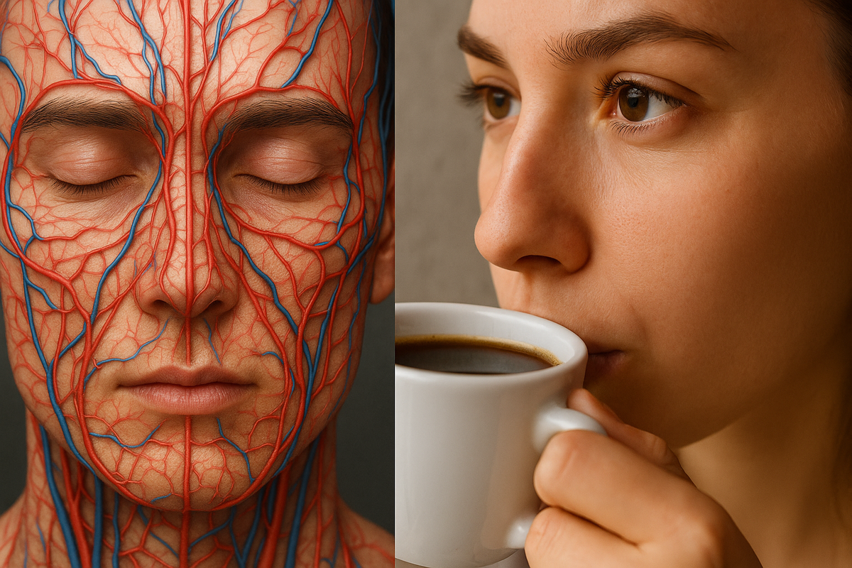 Кофе — один из самых популярных напитков в мире. Для многих людей он стал настоящим ритуалом: чашка утром, днём или перед важной встречей. 1 октября отмечают Международный день кофе — отличный повод поговорить о том, как этот напиток влияет не только на бодрость, но и на состояние кожи и сосудов. Кофеин — главный активный компонент кофе. Он стимулирует нервную систему и влияет на работу сосудов. 📌 По данным European Society of Cardiology (2021), умеренное употребление кофе (2–3 чашки в день) связано с более низким риском сердечно-сосудистых заболеваний, но при злоупотреблении эффект обратный. Кожа — орган, который напрямую реагирует на сосудистые изменения и обменные процессы. Кофеин обладает лёгким мочегонным эффектом. При злоупотреблении кофе это может привести к потере жидкости, а кожа первой реагирует сухостью и тусклым видом. Некоторые исследования (Journal of Clinical Sleep Medicine, 2019) показывают, что кофе, особенно в сочетании с сахаром и молоком, может усиливать воспалител
