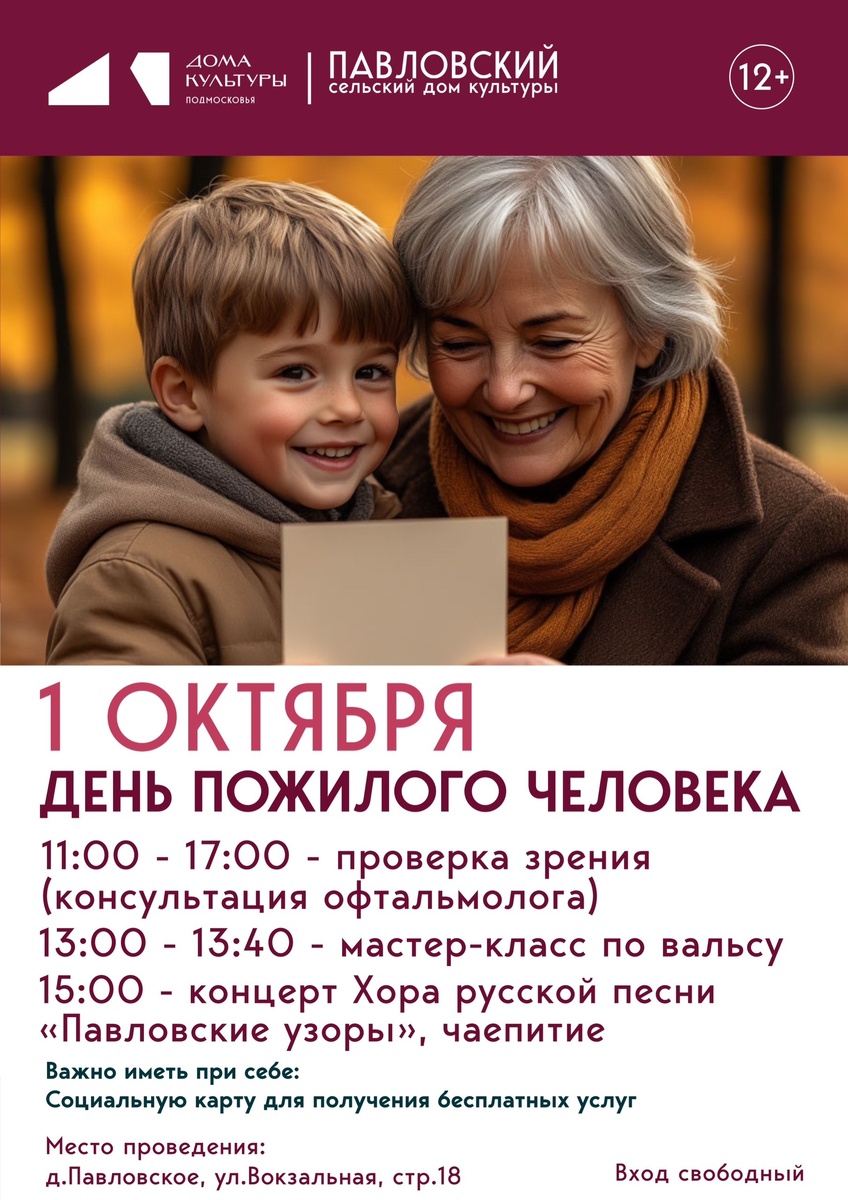 ✨ Дорогие бабушки и дедушки! 1 октября приглашаем вас отметить День пожилого человека в Павловском доме культуры! Программа праздника: ✔️11:00–17:00 — проверка зрения и консультация офтальмолога. Заботьтесь о своём здоровье вместе с нами! ✔️13:00 — мастер-класс по вальсу. Научитесь танцевать красивый танец и получите массу положительных эмоций! ✔️15:00 — концерт хора русской песни «Павловские узоры». Вас ждёт душевная музыка и традиционное русское чаепитие! Важно: для участия в мероприятиях необходимо иметь при себе социальную карту. 🚫 Возраст: 12+ 📆 01.10.2025 🏢 Павловский сельский дом культуры (СДК) 📍 г.о.Домодедово, дер.Павловское, ул.Вокзальная, д.18 💰 Вход свободный❗️ ✅ Мероприятия Домодедово https://dzen.ru/id/66f10385cc4c5a16f7b5fb02 http://vk.com/domodedovo_events http://dzen.ru/domodedovo_events