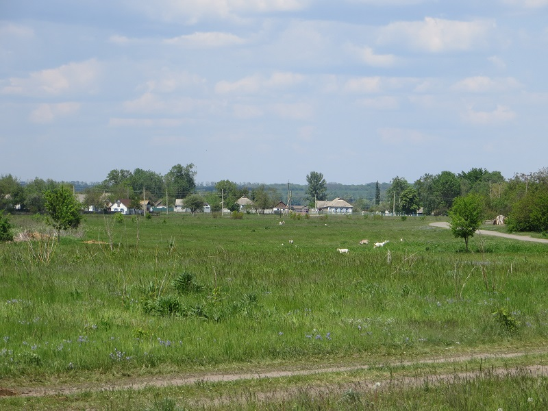 Перед нами приличных размеров лужайка в центре села. Сейчас здесь мирно пасутся козы, иногда коровы, захаживают гогочущие гусиные компании. Также на фото видны и двое футбольных ворот из очень ржавых труб. Они без сетки и стоят отрешенно, как будто из другого мира. Так оно и есть, ныне другой мир растаял в вечности.
