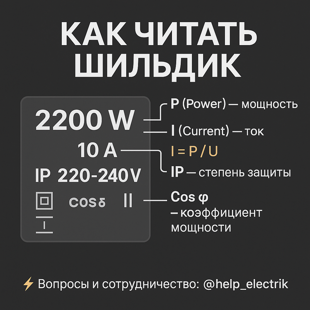 Каждый электроприбор имеет шильдик — наклейку или табличку с характеристиками. Часто люди не понимают, что означают цифры и как их использовать для расчётов. --- Основные параметры на шильдике 1. P (Power) — мощность Указывается в ваттах (Вт) или киловаттах (кВт). Помогает рассчитать нагрузку на сеть. 2. I (Current) — ток В амперах (А). Если не указан, можно посчитать: I = P / U где U = 220 В. 3. U (Voltage) — напряжение Обычно 220–240 В для бытовых приборов. Для техники с другим диапазоном нужны стабилизаторы/трансформаторы. 4. IP — степень защиты Показывает влагозащиту и пылезащиту (например, IP44 — от брызг, IP65 — от пыли и струй воды). 5. Class II класс — двойная изоляция (без заземления). I класс — требует заземления. 6. Cos φ Коэффициент мощности. Чем ближе к 1, тем эффективнее работает прибор. --- Как использовать данные шильдика Проверить, выдержит ли проводка. Правильно выбрать автомат и кабель. Понять, нужна ли защита от влаги.