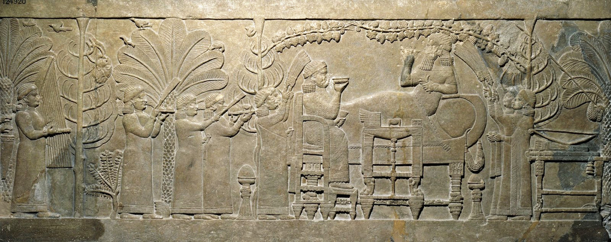 Перед нами настенный рельеф, выполненный неизвестными древнеассирийскими мастерами. Этот предмет входит в группу ассирийских дворцовых рельефов из Северного дворца Ниневии (древний ассирийский город, ныне современный Мосул). На этом рельефе изображены ассирийский царь Ашшурбанапал (правил в 668 – ок. 627 до н.э.) и его жена царица Ашшур-шаррат, отдыхающие в саду. Оба сидят на предметах изысканной мебели в окружении слуг. Две женщины держат салфетки, несколько человек обмахивают царя и царицу, приносят еду и играют на музыкальных инструментах. Пара отдыхает в саду с пальмами, хвойными деревьями и виноградными лозами под пение птиц. На втором дереве слева изображены военные победные трофеи, состоящие из головы и руки, держащей жезл Теуммана, царя Элама. Лица царской четы были изуродованы в 612 г. до н.э. Когда Ниневия была разрушена коалицией бывших ассирийских вассалов, разграбление Ниневии ознаменовало конец Новоассирийской империи. Данный рельеф имеет датировку примерно 645–635