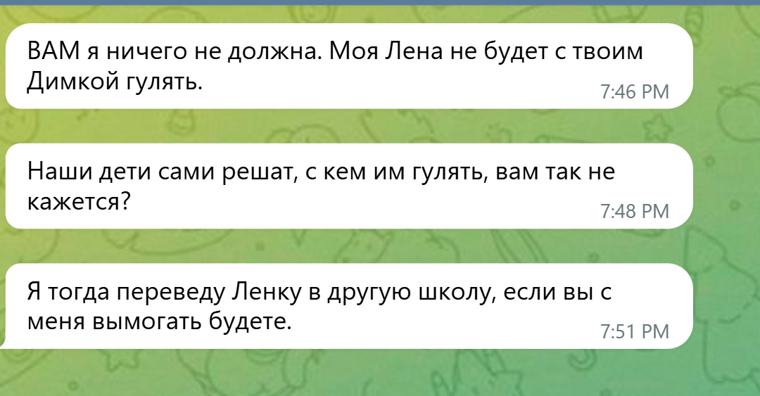 — ВАМ я ничего не должна. Моя Лена не будет с твоим Димкой гулять.