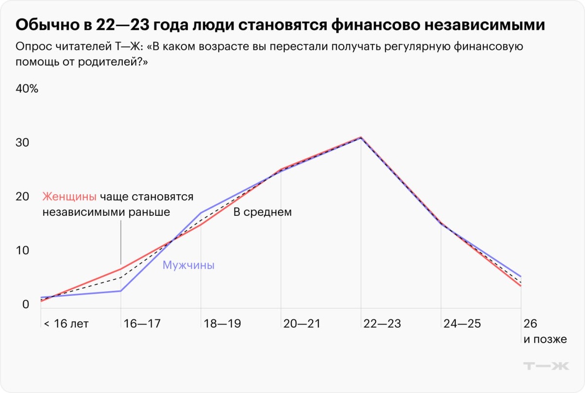 😫 Плохие новости: дети — это очень дорого. ☺️ Хорошие новости: рано или поздно они перестают финансово зависеть от родителей. Больше половины россиян считают, что родители не должны помогать деньгами своим взрослым детям. Причем чаще так отвечают сами «взрослые дети», а не их пожилые родители. Расспросили читателей Т—Ж об этапах их финансовой сепарации: https://t-j.ru/d-tg/opros-pro-nezavisimost-rez/