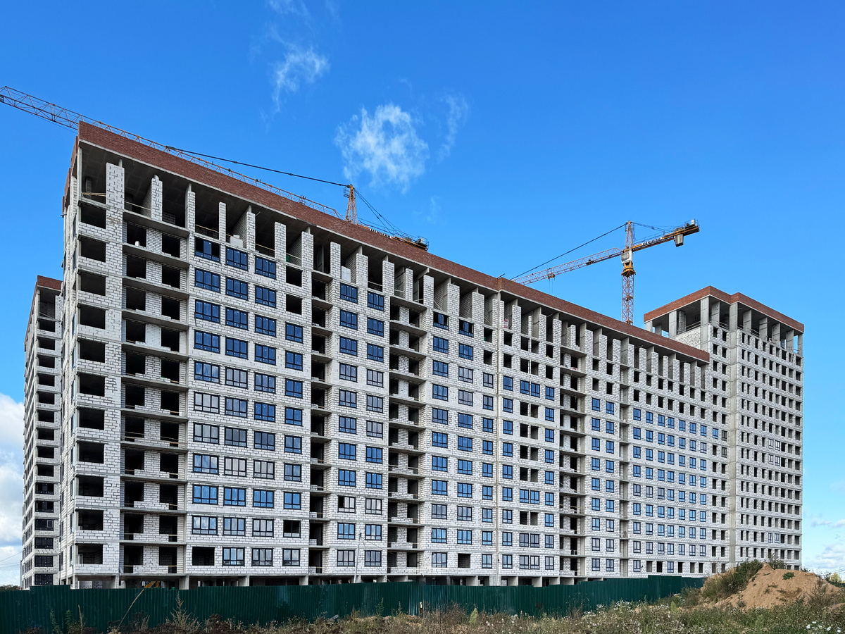 Динамика строительства ЖК «Пушкино Град» в сентябре: демонтированы два башенных крана, проводятся кладочные и кровельные работы