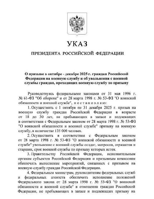 ❗️Владимир Путин подписал указ о начале осеннего призыва 1 октября