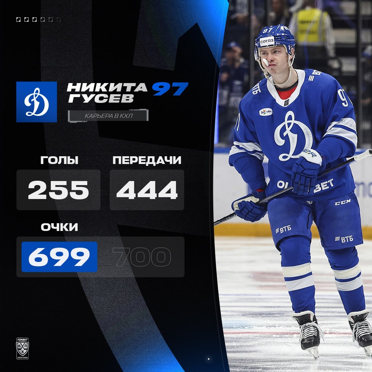 699 — столько очков Никита Гусев набрал за карьеру в КХЛ. Сможет ли #97 продлить свою результативную серию до 7 игр и выбить 700 сегодня вечером?