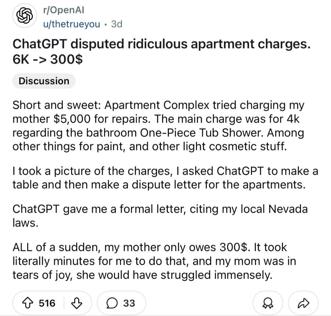 ChatGPT помог сэкономить на ремонте дома. На Reddit чел рассказали, как строители хотели продать свои услуги в 10 раз дороже рынка его родным. Тогда парень сфоткал квартиру и попросил ИИ дать справедливую оценку стоимости работы. Подтверждаю, недавно друг рассказывал, он делает ремонт квартиры в СПб и ровно так же анализирует сметы - переводит из Excel в PDF и просит провести анализ опираясь на стоимость материалов и объема работ. Получает новую смету и дальше торгуется. А я сегодня, для разнообразия, писал с помощью ИИ большое заявление в УК нашего дома, чтобы разрешили провести доп.розетку в паркинг - вдруг когда-то заработаю на Voyah Free EVR Sport Edition :). Русский ИТ бизнес