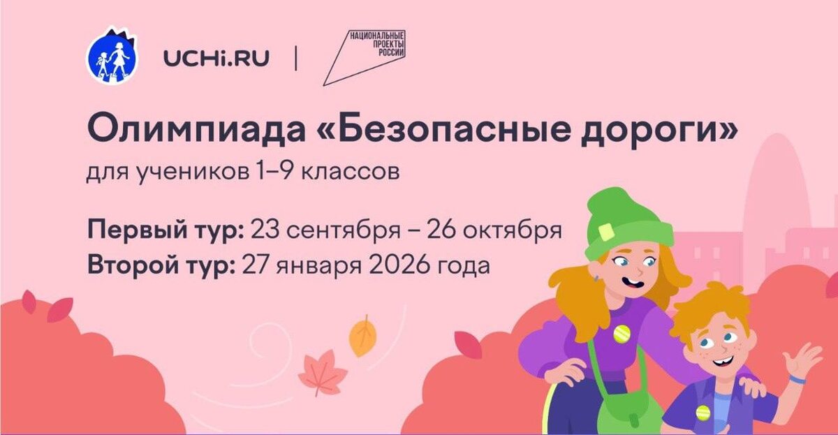 🚧Безопасные дороги🚧 🧐С 23 сентября по 26 октября на платформе Учи.ру проходит бесплатная всероссийская олимпиада «Безопасные дороги» для дошкольников и учащихся 1–9 классов. Это мероприятие входит в проект приказа о перечне олимпиад Минпросвещения на учебный год 2025/26. 📌Цели соревнования: — реализация Стратегии комплексной безопасности детей в Российской Федерации до 2030 года; — повышение уровня защиты несовершеннолетних от дорожно-транспортных происшествий; — просвещение детей по социально значимым вопросам. ✨Олимпиада включает в себя интересные адаптивные задания с озвучиванием, которые помогут ребятам ознакомиться с правилами дорожного поведения и проверить свои знания. ❗️Приглашаем принять участие в олимпиаде, чтобы повысить осведомленность о безопасности на дорогах: https://vk.cc/cPIw4d #Школа1400 #ДОНМ #ПДД1400 #БезопаснаяСреда1400