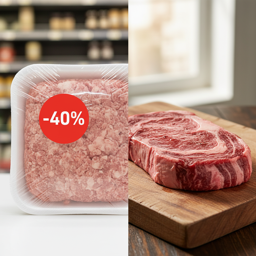 Ты наверняка видел это: на витрине лежит красивый кусок мяса, розовый и «правильный». Берёшь, готовишь дома — а получается подошва. Вроде и деньги заплатил, и стейк должен был быть праздник, а в итоге — жёсткий комок. Почему так? Потому что при выборе стейка есть несколько ловушек, в которые легко попасть. Многие думают: чем ярче и «краснее» мясо, тем свежее. Но стейк — это не помидор. Слишком яркий цвет часто говорит о том, что мясо «освежали» с помощью газовой упаковки. Как правильно: смотри не только на цвет, но и на структуру. Хорошее мясо — упругое, волокна видны, но не рвутся. Мраморность — это тонкие прожилки жира внутри мяса. Именно они делают стейк сочным. Если взять абсолютно постный кусок, на сковородке он высохнет быстрее, чем ты успеешь перевернуть. Как правильно: ищи баланс — не кусок сала, но и не «фитнес-филе». Лёгкая сетка жировых прожилок — твой друг. Шея ≠ рибай, а бедро ≠ стриплойн. В супермаркете часто продают «мясо для стейка», но без указания части туши. А это у