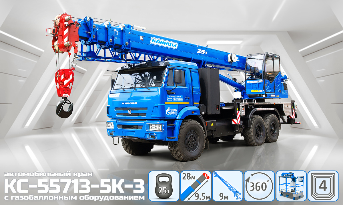 Характеристики КС-55713-5К-3-ГБО (работает на метане) Максимальная грузоподъемность – 25 тонн Максимальный грузовой момент – 85 т∙м Максимальная длина стрелы – 28 метров Длина гуська – 9 метров Опорный контур – 5,0 х 6,1 метров Максимальный вылет стрелы – 26 метров (31 метр с гуськом) Максимальная высота подъема – 28,3 метров (37,3 метра с гуськом) Подробную информацию о технике можете узнать на сайте - https://oaokaz.ru/product-category/avtokrany-na-gazomotornom-toplive/