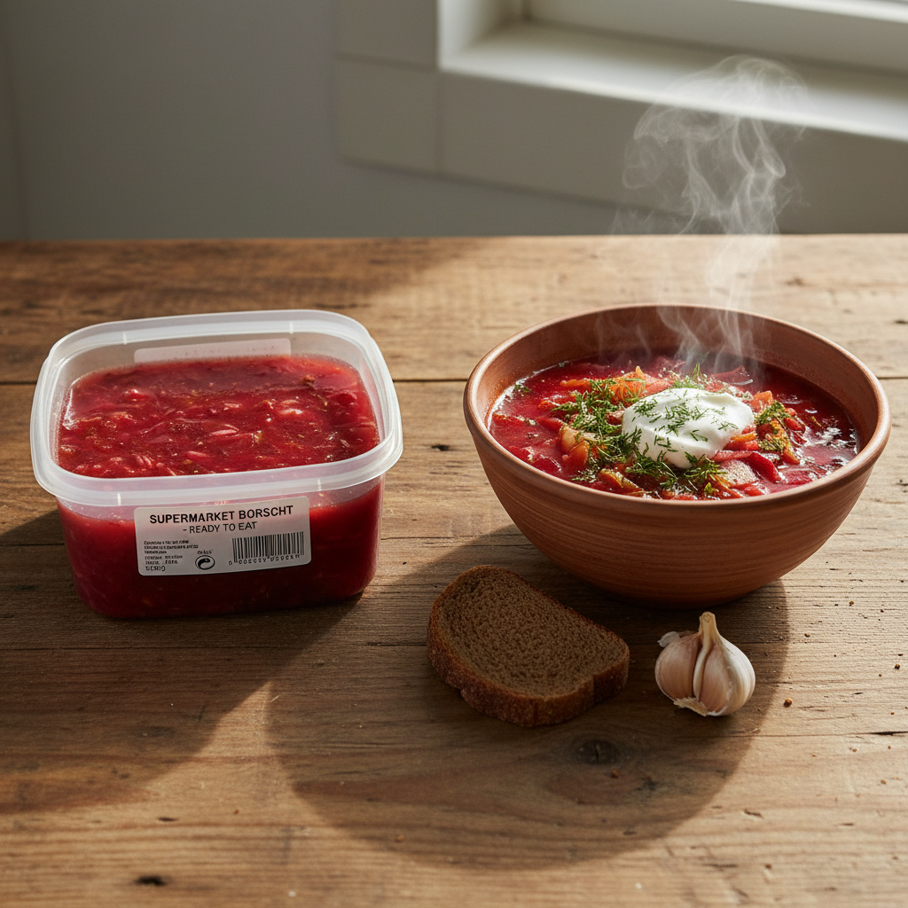 У каждого из нас есть воспоминание о бабушкином борще. На кухне пахнет свёклой и чесноком, пар поднимается из кастрюли, кусочек сала лежит на столе, хлеб тёплый. Это не просто еда — это вкус детства и ощущение дома. Теперь сравним это с борщом из супермаркета: пластиковый контейнер, красивый ярлык, внутри густой красный суп. Разогрел в микроволновке — и вроде бы всё. Но вкус другой. Почему так? Полностью — нет. Потому что дело не только в продуктах, но и в атмосфере. Но приблизиться можно, если использовать свежие ингредиенты и готовить без спешки. Такой борщ требует времени, но вкус — как у бабушки. Главное — качество продуктов. Именно оно определяет вкус. В супермаркете набор для борща часто состоит из овощей, которые давно потеряли сочность. Sigma делает иначе: наши закупщики выбирают овощи на Фуд-Сити каждый день. Свёкла должна быть сладкой, капуста — хрустящей, зелень — пахнуть. Если продукт не радует вкусом, он не попадёт в заказ. В итоге у тебя дома оказывается борщ-набор, из к