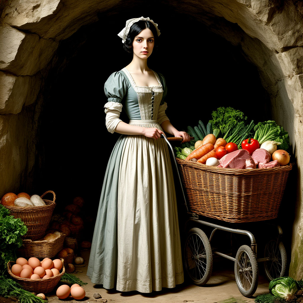 Телега, спрятавшаяся в уголке каменного помещения, была заполнена до самого верха, и размером превосходила меня вдвое. Как её вытащить обратно, на заснеженную поверхность, я не представляла. Я быстро пересмотрела, что удалось найти: овощи, холодные, но все еще ароматные ягоды, выпечка, какие – то уже готовые блюда, а под ними - свежие продукты. Молоко, яйца, куски мяса…