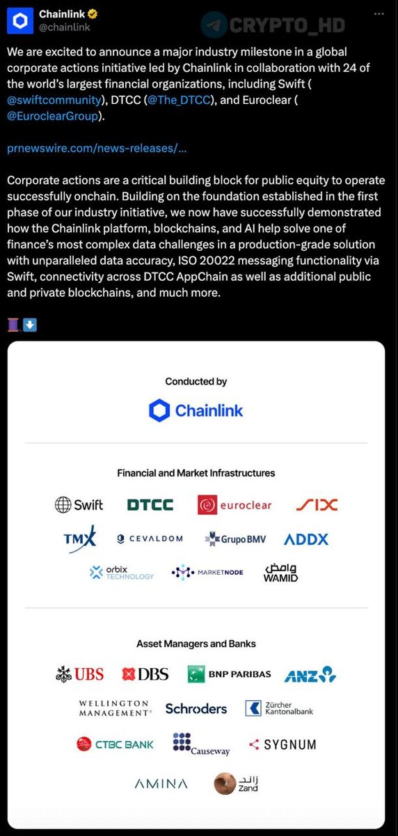 🔥 #LINK Chainlink совместно с 24 финансовыми гигантами решает проблему на $58,000,000,000 – релиз В Chainlink объявили о сотрудничестве с 24 крупнейшими игроками финансовой индустрии (Swift, DTCC, Euroclear, UBS, BNP Paribas и др.), чтобы автоматизировать обработку корпоративных событий (дивиденды, сплиты, слияния). Сейчас на ручную проверку этих данных тратится около $58b в год. Решение: AI-технологии + ораклы Chainlink + блокчейн → данные обрабатываются за минуты, а не дни. Ранее: - Блокчейн-реестр от SWIFT - Saudi Awwal Bank - Chainlink в Европе - Министерство торговли США Crypto Headlines
