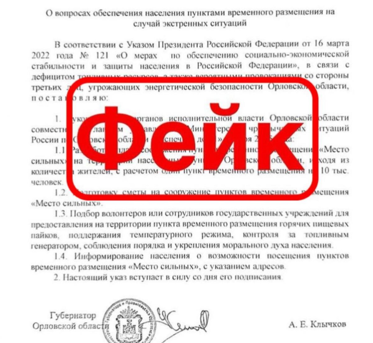 В соцсетях распространяется якобы указ губернатора Орловской области Андрея Клычкова об оборудовании пунктов временного размещения на случай экстренной ситуации из-за дефицита топлива. Как сообщили в пресс-службе областного правительства, документ фейковый. - На самом деле такого документа не существует. Будьте бдительны и доверяйте только проверенным источникам информации, - добавили чиновники. Напомним, ранее "Орловские новости" проверили слухи о начале дефицита бензина, которые можно встретить в информационном пространстве регионов ЦФО. На данный момент в Орле можно заправить транспорт любой маркой бензина и дизелем. Однако, даже немногочисленные произвольные проверки ассортимента АЗС позволили выявить наличие проблем. По теме: «Кроме 92-го неделю уже ничего нет». В Орле есть случаи перебоев с поставками бензина