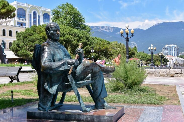 Почти десять лет за суетливой и яркой курортной жизнью наблюдает памятник знаменитому актеру Михаилу Пуговкину. Место под памятник выбрали неслучайно. Именно здесь Михаил Пуговкин сидел на стуле в образе Карпа Савельевича Якина во время съемок фильма «Иван Васильевич меняет профессию».