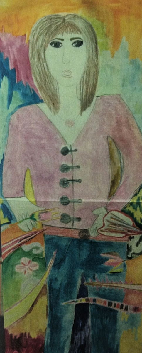 "Взору предстоит стильная дама в блузе типа камзол. Ясность изображения сообщает об открытом и прямом характере у прототипа рисунка. Острые предметы - инструменты для резьбы, поделок - наводят мысль на мастерскую труда. Приоткрытый рот указывает на воспринимаемую воспитанниками контактность сотрудника."