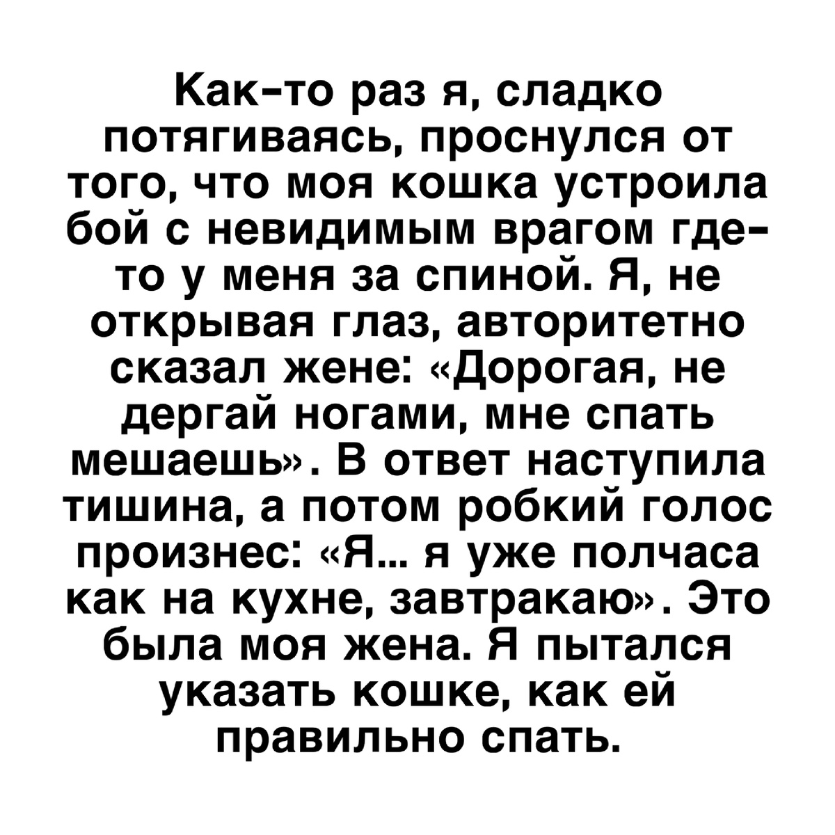 Как-то раз я, сладко потягиваясь, проснулся от того, что моя кошка устроила бой с невидимым врагом где-то у меня за спиной. Я, не открывая глаз, авторитетно сказал жене: «Дорогая, не дергай ногами, мне спать мешаешь». В ответ наступила тишина, а потом робкий голос произнес: «Я... я уже полчаса как на кухне, завтракаю». Это была моя жена. Я пытался указать кошке, как ей правильно спать.