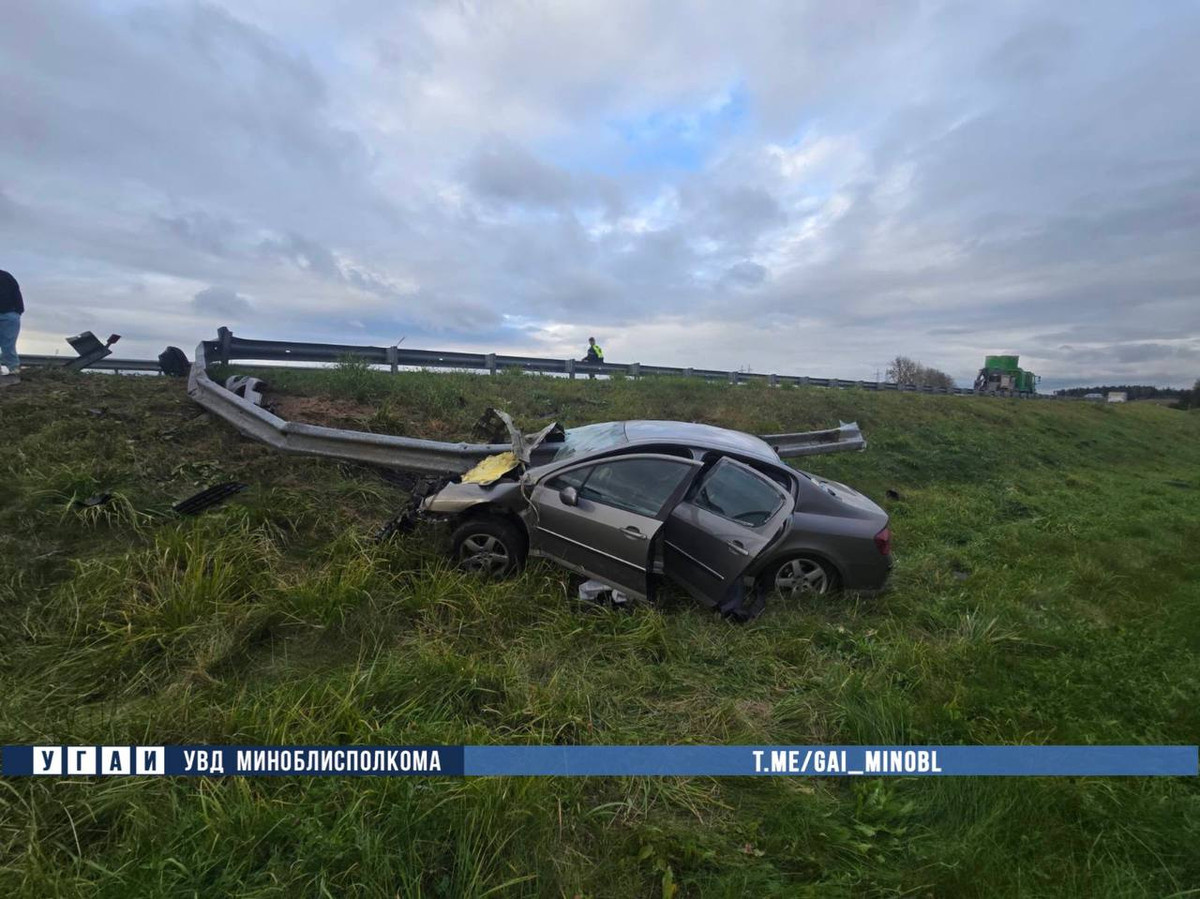 В ГАИ Минской области сообщили об аварии, которая произошла в субботу, 27 сентября, на 58-м км трассы МКАД-2. Там металлическое дорожное ограждение прошило насквозь легковой Peugeot.