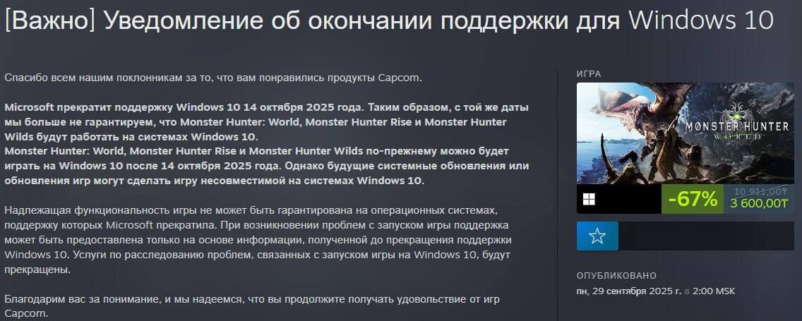 Разработчики игр начинают сворачивать поддержку Windows 10 — первыми это делают в Capcom. Под нож попала серия Monster Hunter. — Microsoft официально прекращает поддержку Windows 10 с 14 октября. — Monster Hunter: World, Rise и Wilds будут запускаться, но стабильность работы на «десятке» с будущими патчами уже не гарантируется. — Эксперты считают, что Capcom распространит такую политику на все свои проекты, а дальше подтянутся и остальные студии. Прощай, легенда.