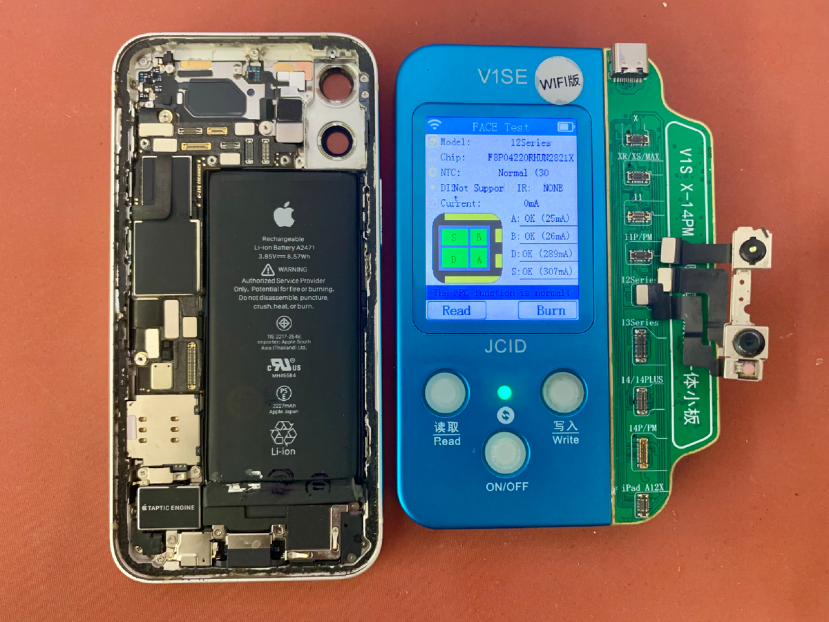Face ID — это не только железо. Если калибровки TrueDepth «поехали», хоть обумосфетись — не взлетит. Проверяю/подтверждаю Dot Projector / Flood через программатор (JCID). Важный момент: узел Flood/Ear Speaker — родной, его нельзя менять «на любой», он привязан к плате (Secure Enclave не дремлет).