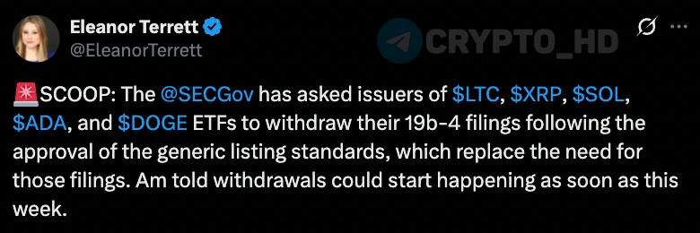 πΊπΈ SEC ΠΏΠΎΠΏΡΠΎΡΠΈΠ»Π° ΡΠΌΠΈΡΠ΅Π½ΡΠΎΠ² ETF Π½Π° #LTC, #XRP, #SOL, #ADA ΠΈ #DOGE ΠΎΡΠΎΠ·Π²Π°ΡΡ ΡΠ²ΠΎΠΈ Π·Π°ΡΠ²ΠΊΠΈ ΠΏΠΎ ΡΠΎΡΠΌΠ΅ 19b-4 (Eleanor Terrett)