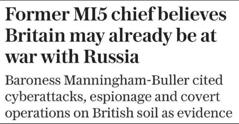 Экс-глава британской Службы безопасности заявила, что Лондон уже в состоянии войны с РФ. Бывшая руководитель контрразведки Великобритании MI5 баронесса Элиза Мэннингем-Буллер выступила с таким заявлением в своем интервью Sky News: https://oboz.info/eks-glava-britanskoj-sluzhby-bezopasnosti-zayavila-chto-london-uzhe-v-sostoyanii-vojny-s-rf/