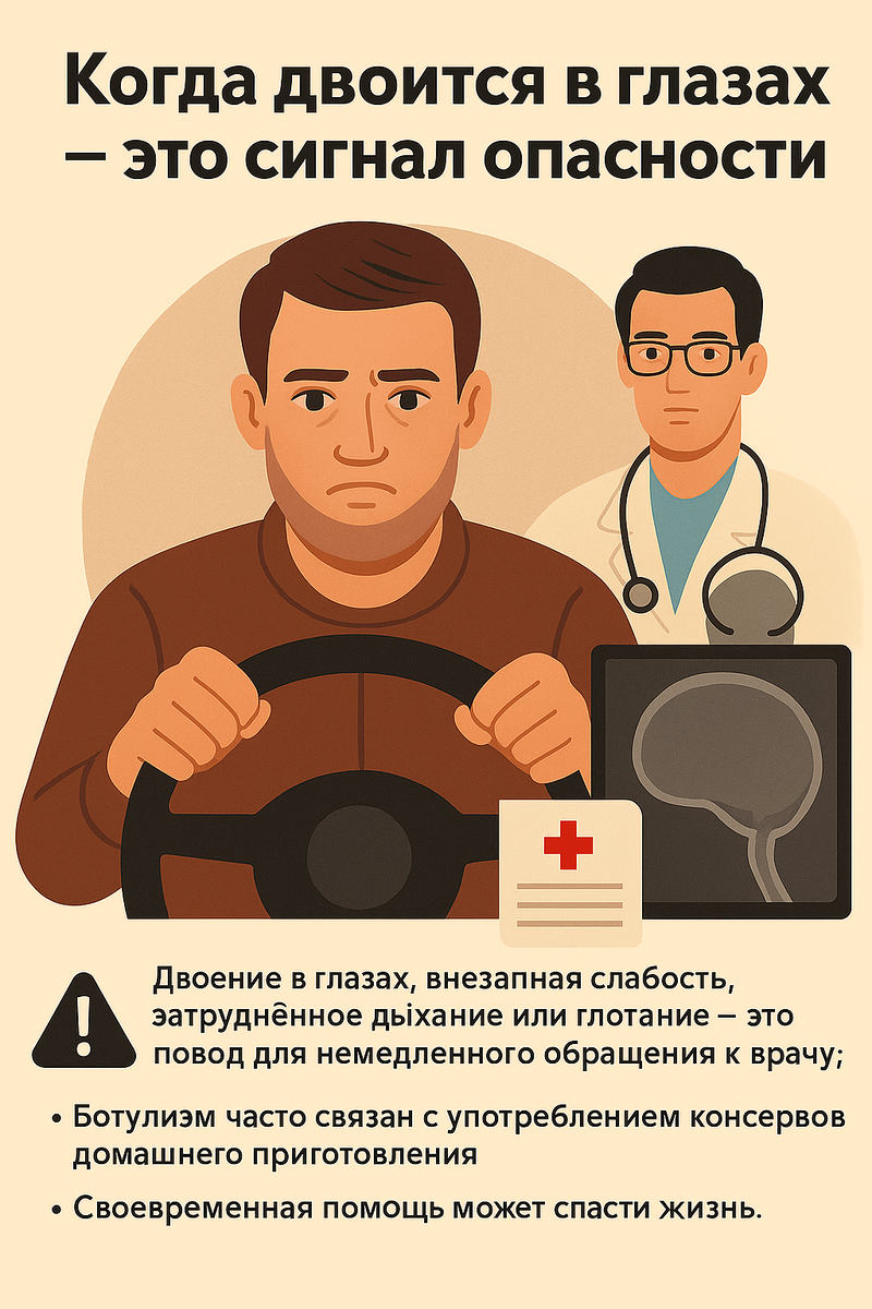 История на реальных событиях. Утро. Мужчина садится за руль, но понимает: в глазах двоится. Работать водителем в таком состоянии невозможно — решает идти за больничным. 👨⚕️ Офтальмолог проверил зрение, глаза здоровы, отправил к неврологу. 🧠 Невролог направил на обследование — рентген в норме. И только рентген-лаборант пишет в заключении: «Диплопия — признак ботулизма». Пациента срочно отправляют в инфекционное отделение. И это было спасением. Отравление оказалось слабым, но потерянный день мог стоить жизни: при ботулизме токсины поражают нервную систему, и смерть может наступить всего за несколько часов. ⚠️ Важно помнить: Иногда один странный симптом — это крик организма о помощи. И лучше проверить лишний раз, чем рисковать самым дорогим. Спасибо за лайк и подписку❤ Любые комментарии приветствуются
