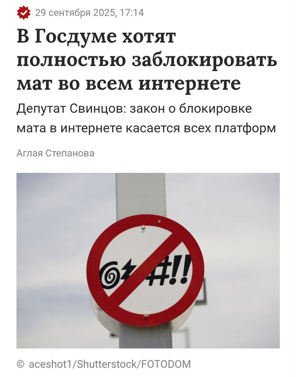 В Госдуме обсуждают законопроект о запрете нецензурной лексики в интернете. В России предложили ввести запрещение на нецензурные слова в интернете, включая соцсети, стримы и видео. За нарушения планируются штрафы, а авторов нецензурного контента будут мгновенно блокировать через РКН, чтобы облегчить нагрузку на контролирующие органы. ────────── ⚡️Важные новости – без лишнего шума!⚡️ Подпишись на канал и получай только суть: оперативно, чётко, по делу! 👉 ИнфоСплетник | @infospletnik
