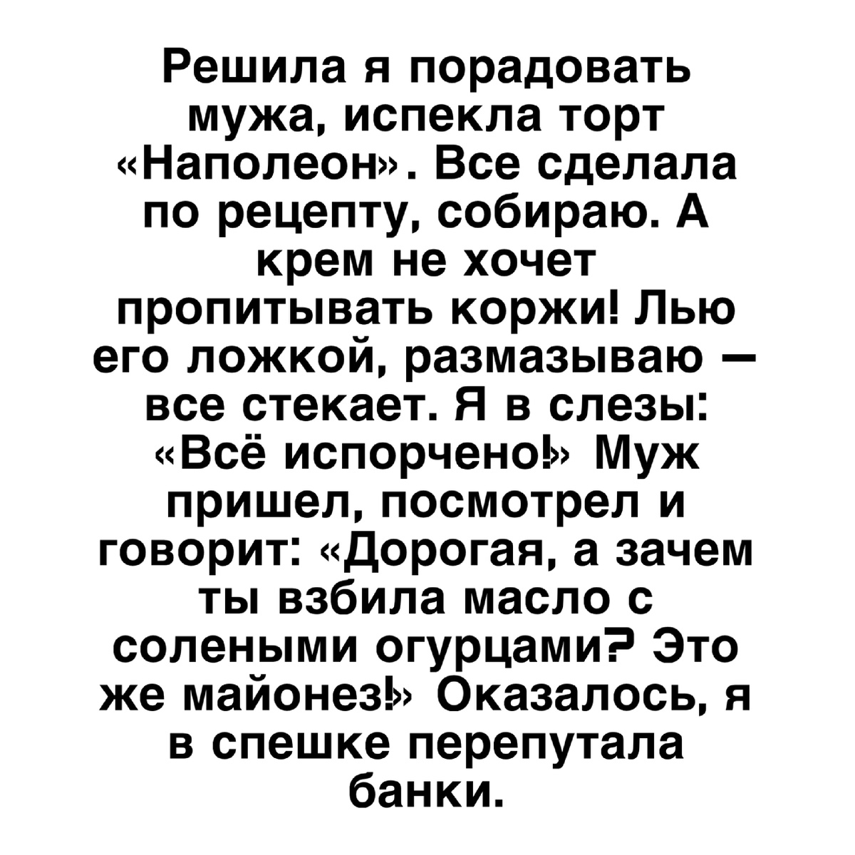 Решила я порадовать мужа, испекла торт «Наполеон». Все сделала по рецепту, собираю. А крем не хочет пропитывать коржи! Лью его ложкой, размазываю — все стекает. Я в слезы: «Всё испорчено!» Муж пришел, посмотрел и говорит: «Дорогая, а зачем ты взбила масло с солеными огурцами? Это же майонез!» Оказалось, я в спешке перепутала банки.