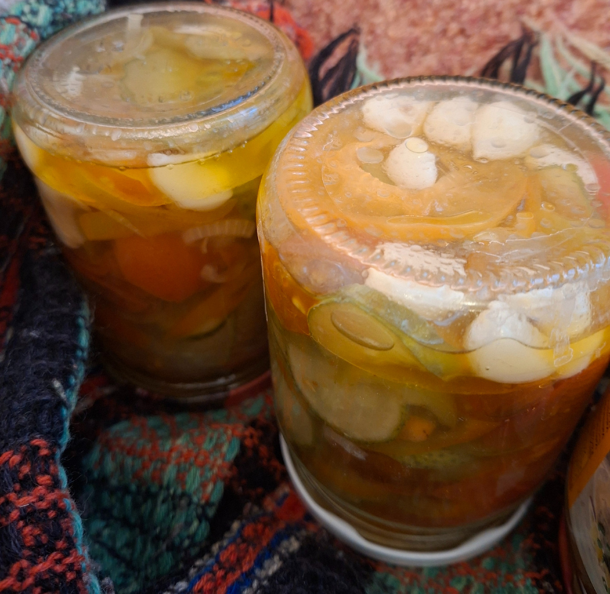 Посмотрела на последние огурчики и поняла, что не очень хочу салата из овощей. Долго эти овощи не пролежат, раз так, то нож в руки и поехали.... Я свой салат на зиму называю "Охотничий", то есть, что нашла в огороде, то и в танки насовала. Порезала огурцы, помидорки, перец (начал вянуть), лук и почистила чеснок. Резала слоями и укладывала прямо в кастрюлю. Сварила свой обычный маринад, добавила подсолнечное масло и варила овощи в этом маринаде около 7 минут, потом разложила салат по банкам, закрыла винтовыми крышками, перевернула и закутала в тёплый плед. Маринад я делаю всегда один и тот же: 100 мл 9% уксуса+500 мл воды+100 грамм сахара+1 столовая ложка соли на литр любой жидкости+душистый и черный горошки, гвоздика+ 100 мл подсолнечного ароматного масла (для этого рецепта). Долго раскачивалась, а потом раз и готово! Цветы мои, завидев меня дома, начали цвести, как "ошалелые", похоже заманивают меня на постоянное место жительства. Пришлось за ними поухаживать, что-то перес