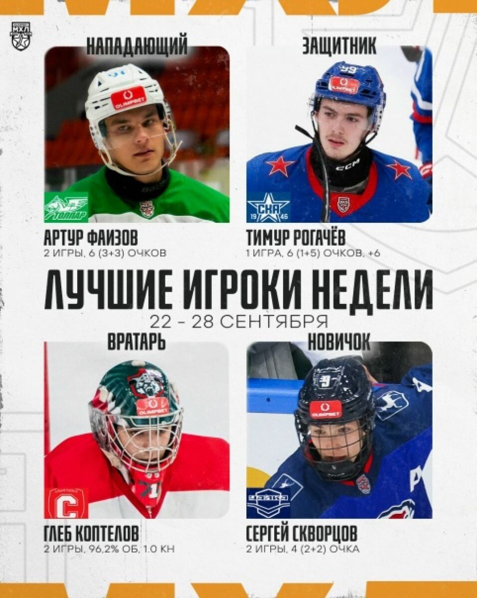 Официальный сайт МХЛ назвал имена наиболее выдающихся хоккеистов четвёртой недели регулярного чемпионата сезона 2024/2025. Лучшим вратарём признан Глеб Коптелов, представляющий «Спутник». В течение прошлой недели «Спутник» добился двух выездных побед, обыграв «Динамо-Карелию» и «Спартак МАХ». Коптелов отыграл оба матча (120 минут) и пропустил лишь одну шайбу. В игре против «Спартака» он оформил свой первый шатаут в МХЛ. Во время этих матчей по воротам 16-летнего Коптелова было нанесено 53 броска, из которых голкипер отразил 51 (96,2%). Коэффициент надёжности вратаря составил 1,00. Оба показателя являются лучшими среди всех вратарей Восточной конференции. Лучшим защитником назван Тимур Рогачёв из «СКА-1946». 19-летний защитник принял участие в одном матче, в котором забросил шайбу и отдал пять результативных передач (6 очков) с показателем полезности «+8». Он стал самым результативным защитником недели. Рогачёв не заработал штрафных минут, заблокировал один бросок, совершил один перехва