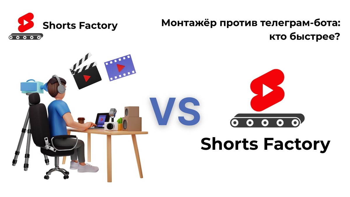Сегодня, когда вертикальный короткий контент задаёт тренды, важна не только идея ролика, но и скорость его производства. Алгоритмы YouTube Shorts, TikTok и Reels любят стабильность: регулярные публикации приносят охваты, а значит — внимание аудитории. Есть два пути. Первый — классический: монтажёр вручную нарезает материал, подбирает фрагменты, делает субтитры. Второй — автоматизация: бот, который превращает длинное видео в готовые шортсы за минуты. Сервисы для автоматической нарезки снимают рутину: Итого: вместо 6–20 тысяч рублей за 20 роликов у монтажёра — около 2 тысяч рублей с ботом. Экономия времени и бюджета очевидна. Если речь про брендовые проекты, рекламные кампании или авторский ролик с графикой и анимацией — ручной труд по-прежнему вне конкуренции. Но для регулярного выпуска шортсов в соцсети автоматизация решает задачу быстрее и дешевле. Shorts Factory — это бот, который превращает длинное YouTube-видео в готовые короткие ролики для Shorts, Reels и TikTok. Что умеет: Попроб