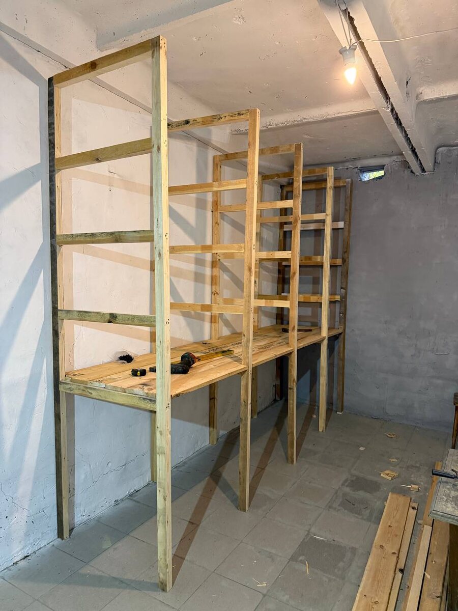 В малом гараже 17,5м2 стены после окраски высохли, приступил к сборке стеллажа для своего богатства 🤣 Глубина полок 80см, что-то прям
