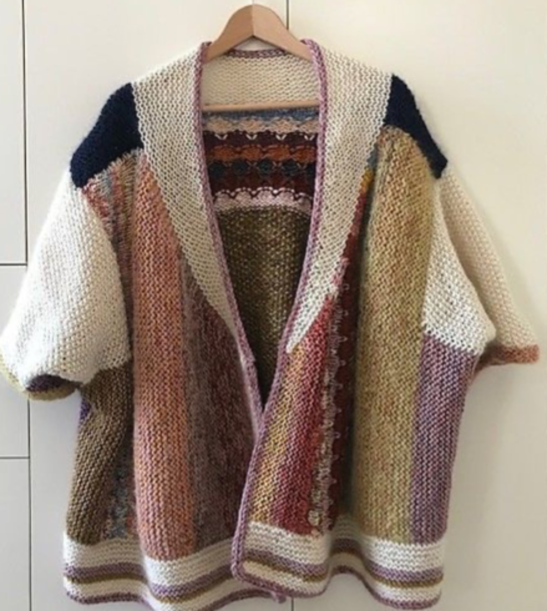 Иногда попадаются такие модели, которые с первого взгляда кажутся загадкой. Недавно на Pinterest я увидела интереснейший жакет (или можно сказать кардиган) от мужчины-дизайнера. Подробное описание этой модели продаётся на Ravelry, но мне хватило картинки и раскладки, чтобы понять принцип вязания — и хочу поделиться этим с вами. ✨ Чем интересна модель? Во-первых, это поперечное вязание. Все детали связаны так, что основное направление петель идёт не привычно снизу вверх, а от боковой линии. Во-вторых, это отличный проект для использования остатков пряжи. Конечно, можно связать и в однотонном варианте, но особенно выигрышно модель смотрится в сочетании разных цветов и фактур. В этой модели есть один важный момент: Здесь легко запутаться, поэтому внимание к образцу — обязательно! Подрез в этой модели достаточно большой, квадратной формы. Это даёт простор и удобство для рукава. Его можно: Смотрится очень эффектно и современно. Воротник выполнен укороченными рядами. Очень прост