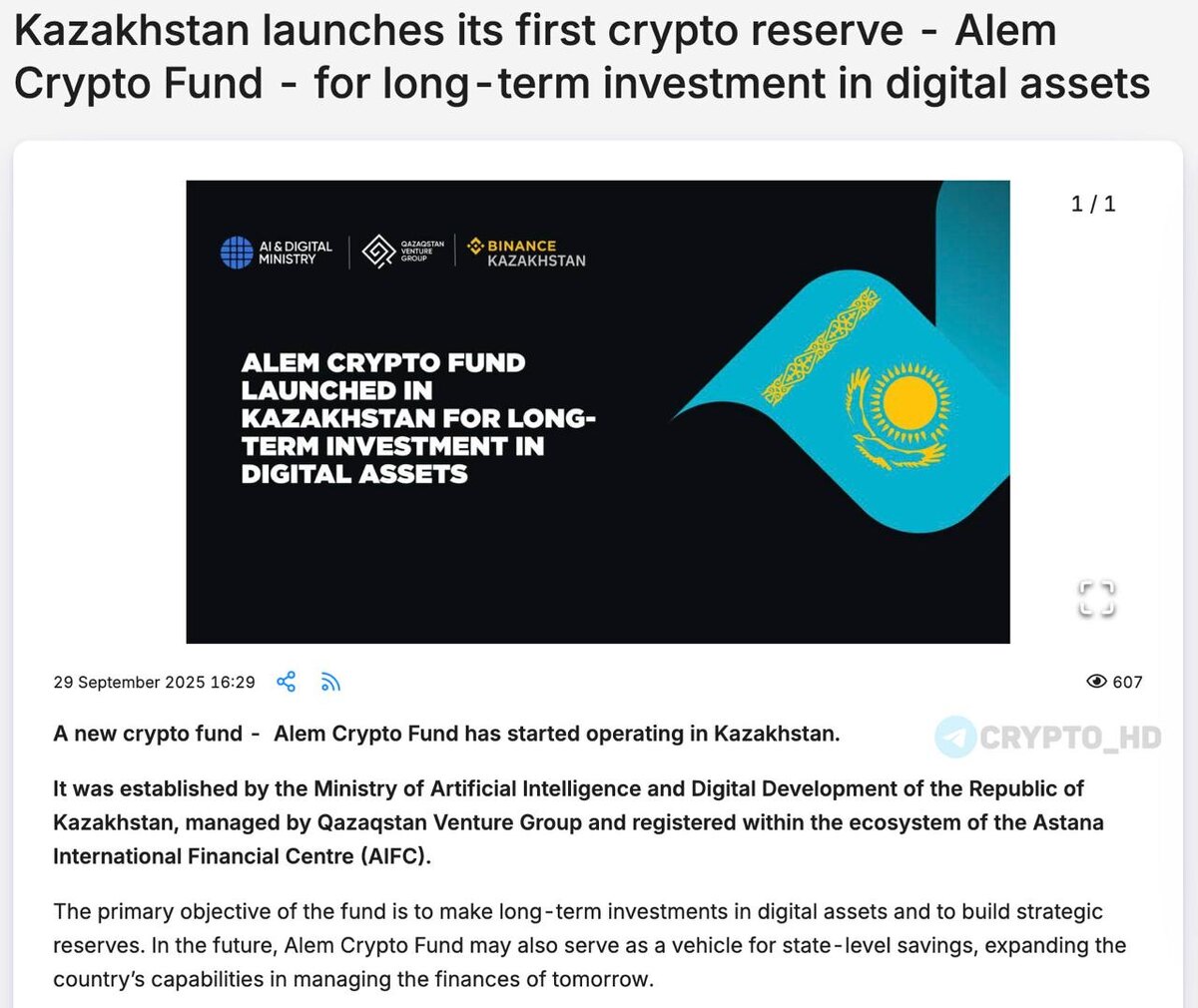 Министерство искусственного интеллекта и цифрового развития Казахстана создало «Alem Crypto Fund», ориентированный на долгосрочные инвестиции в цифровые активы и формирование стратегических государственных резервов.