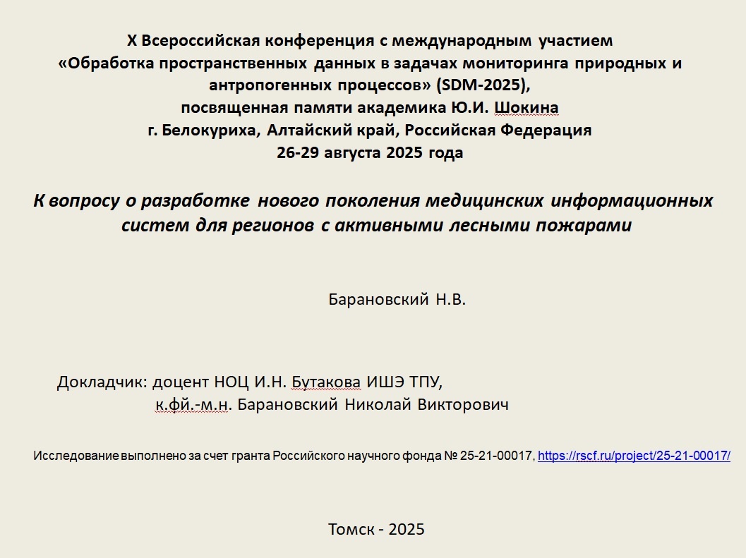 В конце лета мы представили наши первые результаты научного проекта 25-21-00017 “Детерминированно-вероятностный подход прогнозирования воздействия выбросов аэрозоля и углеродистых частиц от лесных пожаров на здоровье населения” на конференции в Белокурихе. Данный проект поддержан Российским научным фондом. Мы выполняем его с начала 2025 года. Конференция называется “Обработка пространственных данных в задачах мониторинга природных и антропогенных процессов”. Конференция имела статус Всероссийской с международным участием и была посвящена памяти академика Юрия Ивановича Шокина. Конференция организована была Федеральным исследовательским центром информационных и вычислительных технологий (ранее Институт вычислительных технологий Сибирского отделения Российской академии наук, город Новосибирск). Кроме того, в числе организаторов - Институт динамики систем и теории управления им. В.М. Матросова СО РАН, Институт автоматики и электрометрии СО РАН, Новосибирский национальный исследовательский