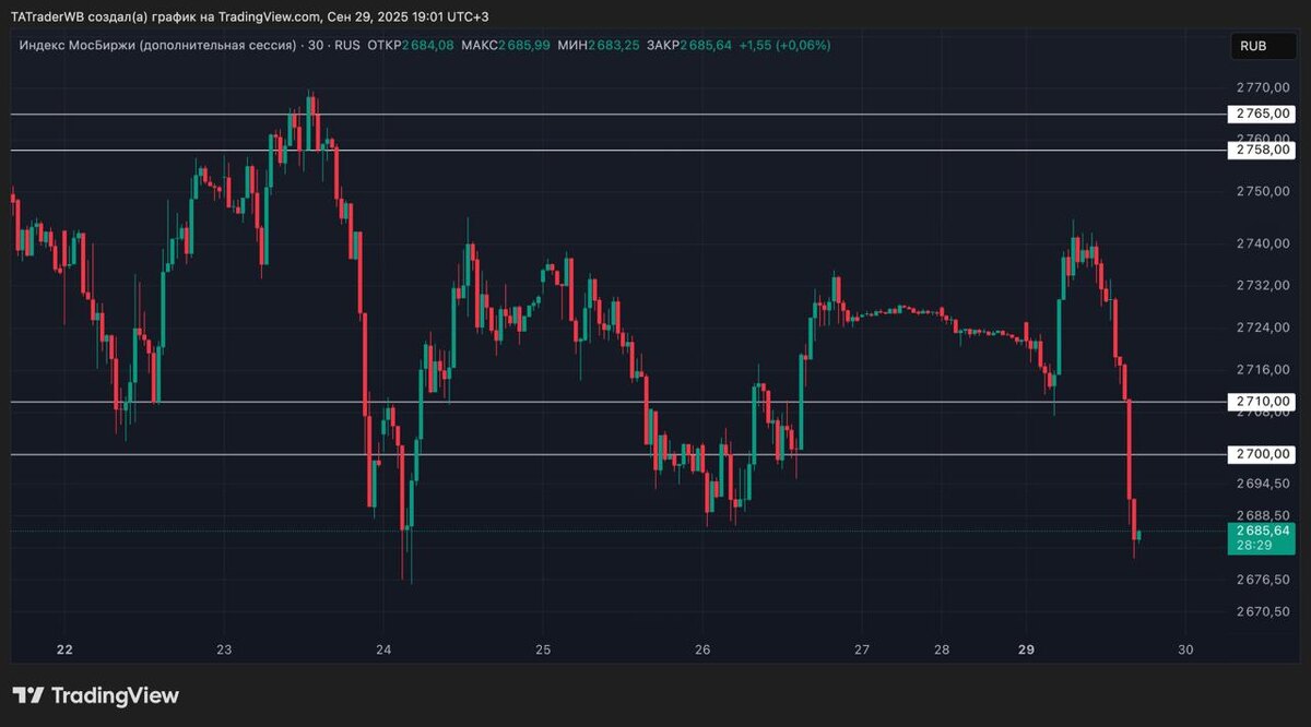 🫗 Вылили… Весь сегодняшний рост на смарку. 💯 Утром рынок чувствовал себя достаточно сильно, подрастая в моменте, дав нам заработать на Лонгах. После локального боковика начали выходить новости, на которых пошло вертикальное падение, да так, что впервые рынок закрыл основную сессию ПОД 2700… Слабость… Однако важно понимать, что слили рынок не просто так, а на новостях, а значит аргмагедонить НЕ нужно. ✅ Сформировать разворот у рынка не получилось и один из минимумов он уже забрал. Когда такое происходит, очень скоро забирается и второй минимум, который приходится на 2675. Поэтому жду коррекцию по рынку в сторону 2670 - 75. Однако касаемо завтрашнего приоритета есть нюансы. Они заключаются в том, что если рынок уже сегодня заберет 2675, то завтра логичнее всего бы смотреть в сторону лонга. Если же наоборот, вечерку откупят и цена пойдет к 2700 - 2710 (блоку сопротивления), то от туда можно будет смотреть шорты к 2675. Как то так. Завтра утром, как всегда напишу, куда и в какую сторон
