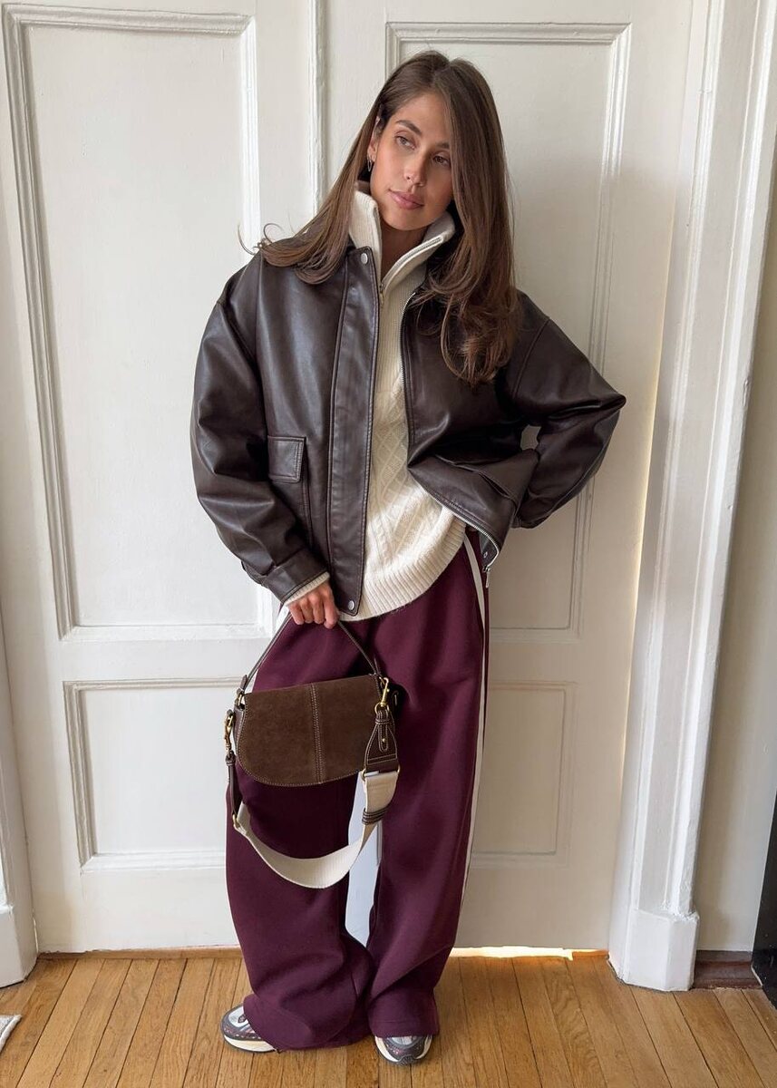 Собираемся вместе на прогулку 🤩 Такой у нас образ в стиле спорт-шик получился: 🤎молочный джемпер на замочке; 🤎брюки от спортивного костюма в цвете «марсала»; 🤎шоколадный бомбер из экокожи. Так просто, но при этом стильно, комфортно и самое главное — тепло!