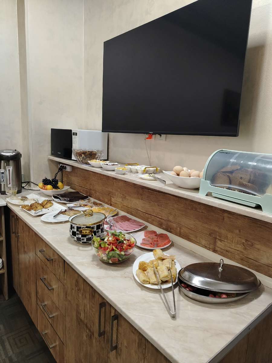Выспались мы все хорошо - кровати в гостинице оказались удобными. В проживание входит завтрак шведский стол с узбекским уклоном. Все было вкусным, особенно фруктовый рулет.