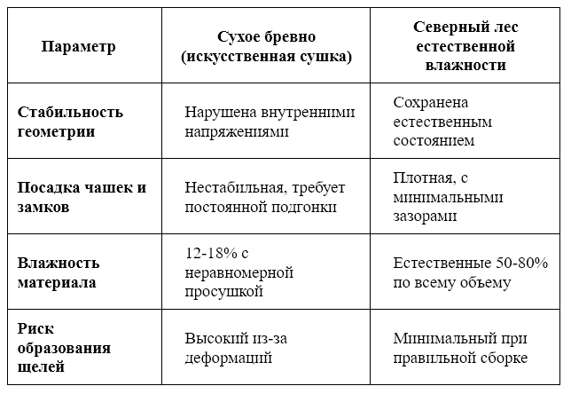 Быстрая технология — не значит лучшая, когда речь идет о натуральном дереве. В современном строительстве все чаще пропагандируется использование сухого оцилиндрованного бревна. Производители утверждают, что это якобы более совершенный материал с контролируемой влажностью. Однако практика показывает, что такая технология нарушает естественную природу древесины и приводит к серьезным проблемам в эксплуатации. Критический недостаток искусственно высушенного бревна — нарушение стабильности геометрии. С технической точки зрения, принудительная сушка создает внутренние напряжения в древесине, которые проявляются уже при сборки сруба. Проще говоря: когда подсушенное бревно начинает "гулять" от перепадов влажности, его ведет, крутит, чашки выгибаются, и весь конструктор перестает совпадать. Образуются щели, которые невозможно устранить обычной конопаткой. В отличие от этого, бревно естественной влажности 50-80% сохраняет стабильную геометрию и равномерно усаживается всем массивом, обеспечивая
