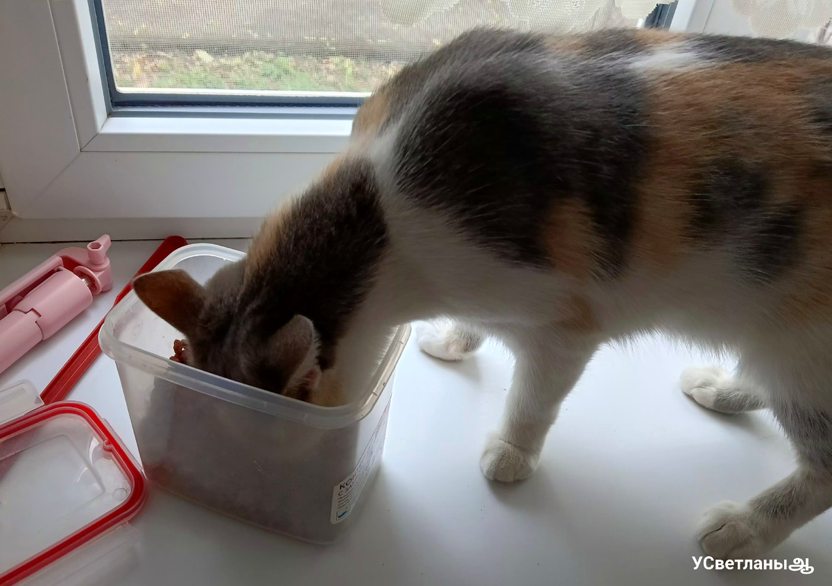 Не успели поставить лоток с кормом и открыть его, как Машенькина мордочка каким-то чудным образом оказалась внутри.